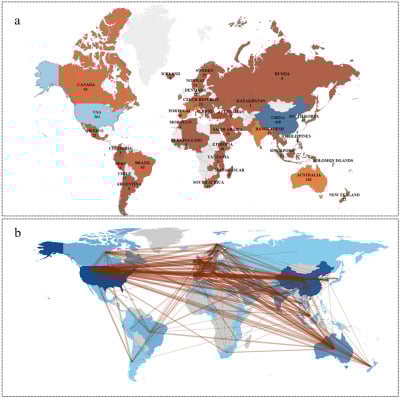 In this study, using CiteSpace (6.2.R6), VOSviewer (1.6.20), and RStudio Bibliometrix (4.4.0), we show that the number of publications in this field is growing rapidly every year, especially after 2019. Among the top countries and regions, China ranks first with 158 publications, followed by the United States with 142 publications, indicating that China and the United States are leading in this field. In recent years, China’s rapid scientific development has been closely related to strong national support for scientific research and talent cultivation. However, compared to China, the United States has higher Multiple Country Publications (MCPs) and MCP_Ratio indices, representing a more solid research foundation and outcomes in this field. In addition to China and the United States, the United Kingdom and Canada have lower publication volumes but higher MCP_Ratio indices, which means scholars from these countries maintain close contact with each other and actively engage in cooperation. The country cooperation network shows that China and the US are in central positions with the thickest boundaries between them, representing a very close cooperative relationship. The interwoven connections between countries mean scholars and institutions have made great efforts to eliminate academic barriers, promote academic cooperation, and exchange knowledge.