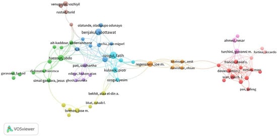 In co-author analysis, different nodes represent different authors, and thicker lines between nodes represent closer collaboration. The size of the circles reflects the number of papers published by the same author. Among all authors, 83 authors with the strongest connections were selected. These authors are distributed in 10 clusters, with the author Fatih Ozogul having the highest number of connections at 28, currently working as a professor at the University of Cukurova. The second-ranked author, Piotr Kulawik, has a total of 16 connections. Although Joe M. Regenstein has the highest number of citations, they are not at the center of the cluster due to a weaker connection strength. The distribution of authors in the field of seafood cold chain logistics shows a characteristic of “wide dispersion and small-scale concentration”. Most authors are engaged in independent research, but many authors have also established collaborative relationships.