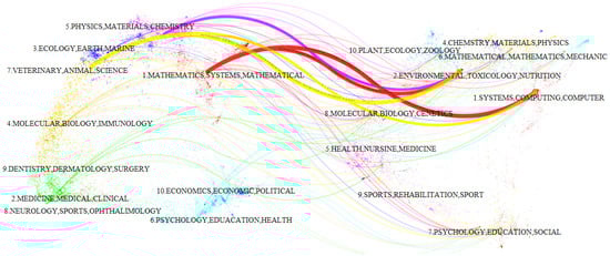 The left side of the overlay is the citing map, representing the forefront of the research disciplines, while the right side is the cited map, representing foundational journals, with different colors indicating different disciplines. The wavy lines in the overlay represent the interdisciplinary connections of seafood cold chain logistics research. There are five prominent citation lines (two yellow, two red, and one pink), with thicker lines indicating closer citation relationships. It is evident that Discipline 1 (mathematical operations, systems, and mathematics-related, z = 5.42, f = 4417) and Discipline 7 (veterinary, animal, and science, z = 4.35, f = 3640) account for the majority of citing journals. The distribution of cited journals is mainly concentrated in Discipline 1 (systems, computing, and computer) and Discipline 2 (environmental, toxicology, and nutrition), indicating that journals in the systems, computing, and environmental fields are frequently cited.