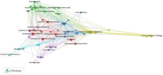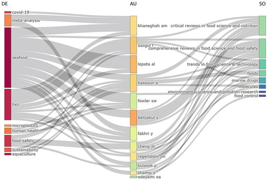The Sankey diagram in Figure 14 illustrates the relationships between keywords (left), authors (center), and journals (right) in a three-dimensional manner. The diagram describes the authors’ contributions to relevant journals and their preferences for keywords. According to the Sankey diagram, the thicker the connecting lines between variables, the higher the number of connections. The most productive author is Fatih Ozogul, who has published articles in journals such as “CRITICAL REVIEWS IN FOOD SCIENCE AND NUTRITION”, “COMPREHENSIVE REVIEWS IN FOOD SCIENCE AND FOOD SAFETY”, “TRENDS IN FOOD SCIENCE & TECHNOLOGY”, and “MARINE DRUGS”. The most frequently used keywords in her research are “seafood”, “fish”, “meta-analysis”, “human health”, and “sustainability”. The second-ranked author is A. Hassoun, whose most frequently used keywords in her research are “fish”, “meta-analysis”, “human health”, and “sustainability”.