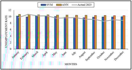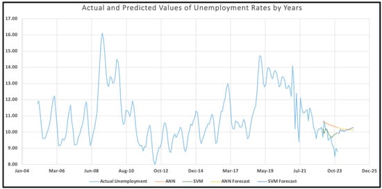 In this study, two different models were used to forecast the unemployment rate on a monthly basis. In the first model, 228 monthly data points obtained from TURKSTAT covering the period between 2005 and 2023 were made ready for processing, and ANN and SVM algorithms were applied. We used the data covering the years 2005–2022 as the training set and the remaining data for the year 2023 as the test set. We compared the actual and predicted values with the 2023 data and calculated their performance metrics. We also attempted to predict the unrealized values for 2024 using the employed methods.