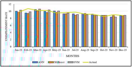 This study aimed to estimate the unemployment rate in Turkey on a monthly basis using machine learning methods. We modeled the monthly exchange rate, inflation rate, and labor force data obtained from TURKSTAT for the period 2005–2023 in two separate applications. The study employed two distinct models for this purpose. We first modeled unemployment data for the years 2005–2023 by dividing them into training and testing processes using ANN and SVM algorithms, and then calculated the accuracy and performance percentages of the obtained results. The results confirmed that the ANN and SVM are highly effective in predicting unemployment rates using previous data. These models were able to capture complex, non-linear relationships in the data and provide higher accuracy rates compared to traditional statistical methods. As the next step, the inclusion of the XGBoost algorithm in the second model significantly enhanced forecasting accuracy. This model, which incorporated additional economic parameters such as inflation, exchange rate, and labor force data, outperformed the ANN and SVM models. The XGBoost algorithm’s ability to handle large datasets and complex models makes it a valuable tool for economic forecasting. We then compared the forecasting performances of the ANN, SVM, and XGBoost models using standard evaluation parameters such as RMSE, MAE, MAPE, and R2. The study’s findings reveal that economic parameters such as exchange rate, inflation, and labor force have an impact on unemployment. The study’s forecasting results coincided with the actual unemployment rates. Moreover, after comparing all the findings and results, we concluded that the ANN is the best prediction method for Model-1, and the XGBoost model is the best for Model-2.