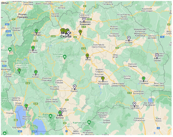 Locations of official air-monitoring stations in Macedonia. Source: Ministry of Environment and Physical Planning’s Air Quality Portal, available at https://air.moepp.gov.mk/?lang=en, (accessed on 3 June 2024).