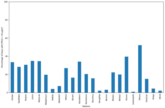 To provide insights into the distribution of polluted days across the monitoring stations, we calculated the percentage of days with PM10 levels exceeding 50 µg/m3 for each station across all 10 years from the gathered data available on the official website of MOEPP. As shown in Figure 2, stations like Tetovo and Kicevo exhibit the highest frequency of high-pollution days, indicating persistently poor air quality.