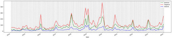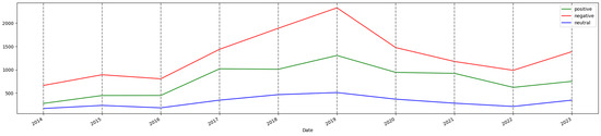In order to understand the extent of the involvement of each type of sentiment, we analyzed the yearly percentage of positive, negative, and neutral news articles (Figure 5). In 2014, negative sentiments accounted for around 60% of the total, but this had gradually decreased to just above 50% by 2017 (Figure 5), with another gradual increase until 2019 to about 60%, before decreasing in 2021 and following an upward trend until 2023. Positive sentiments increased from about 30% in 2015 to around 40% in 2024. Neutral sentiments remained between 10% and 15% throughout the period. The most significant drop in negative sentiments occurred around 2017 and 2018, while positive sentiments increased during the same period. In recent years (2021–2024), there has been a notable increase in both positive and negative sentiments, with neutral sentiments remaining largely unchanged.