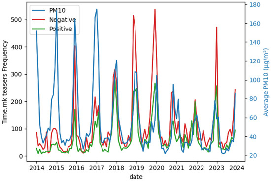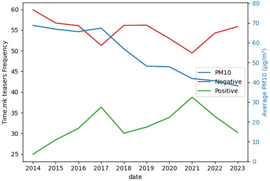 In addition to the monthly cross-correlation analysis (Figure 6), we investigated the yearly trends in the average number of PM10 concentrations and Time.mk teasers (Figure 7). The yearly analysis of both the average levels of PM10 particles and the average number of news articles elucidated fluctuating trends during longer time periods. In Figure 6, the yearly PM10 levels show a decreasing trend from 2014 to 2021, indicating an overall improvement in air quality over this period. There is a slight increase in 2022 and 2023. The frequency of negative news teasers also shows a slight decline from 2014 to 2021, which suggests that while overall pollution levels show improvement over the years, specific periods still posed challenges, prompting continued media attention to this issue. The frequency of positive news teasers shows an increasing trend from 2014 to 2019, peaks around 2021, and then starts to decline.