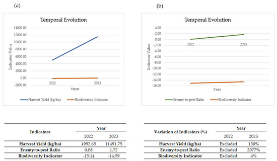 Temporal evolution of biodiversity, harvest yield, and enemy-to-pest ratio of the decision support system. (a) Temporal evolution of biodiversity indicator vs harvest yield and values of indicators. (b) Temporal evolution of biodiversity indicator vs enemy-to-pest ratio and indicators variation in percentage.