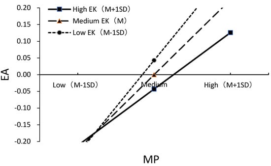 Specifically, this paper presents the construction of structural models to test the significance of the effects of MP and PIM on EA, MP and PIM on GPB, and EA on GPB. Subsequently, the mediating effect of EA is examined. Finally, interaction terms are constructed to test the moderating effects of EK on the independent and mediating variables and the moderated mediating EA.