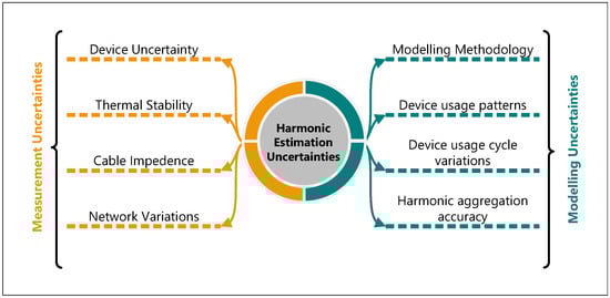 The variability in the load connected to the network is due to the stochastic behavior of end-user load usage [18]. Furthermore, there are various types of loads that can be classified based on their circuit topologies or the nature of the current they draw from the network. The type and amount of load are different in each household, and the usage behavior of the occupants results in a dynamic profile of harmonic emissions from each household. The harmonic emission is subjected to harmonic cancellation within the electrical circuit of the household and also at the PCC [19]. As several households are connected to the low-voltage end of the distribution network, their collective emissions may result in further aggregation of individual harmonic components as well as be subject to variation in the supply voltage on the distribution network side [20]. Measurement uncertainties include device uncertainty and accuracy margins, as well as various variations in the measurement data. These variations typically correspond to the thermal instability of the loads during power quality measurements and the impact of cable impedances on the harmonics. The dynamic conditions of the network in terms of voltage harmonics also cause variations in current harmonic emissions from the loads. These variations and uncertainties at various levels in the modeling and measurements influence the estimation of harmonic emissions. Therefore, it is crucial to assess these variations, uncertainties, and inaccuracies, to construct a reliable model that can provide more accurate harmonic level estimates.
