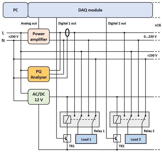 We used a broad measurement database that includes power quality measurements of several end-user loads at various voltage waveforms. To automate the process of measurement, we used a test bench capable of recording power quality indices of 16 loads at a time on several voltage waveforms. The test bench included a power quality measurement device, PQ Box 200 (A-Eberle, Nürnberg, Germany), having a sampling frequency of 41 kHz. It further included a National Instrument (NI) data acquisition (DAQ) board that provided digital input to a control box based on the signal generated using a MATLAB program. The control box includes relays to control the loads. We used two different programmable power sources, a 1.7 kVA Omicron C356 and 4 kVA Chroma 61505. A reference signal to control the output of these programmable power supplies was also generated from the DAQ board using the MATLAB program. Figure 3 provides a block diagram representation of our measurement setup.