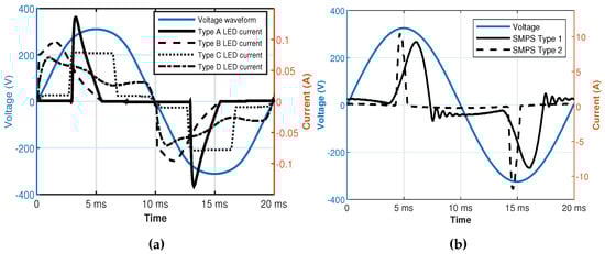 Current waveform from different loads (a) LED lamps (b) Switch Mode Power Supplies.