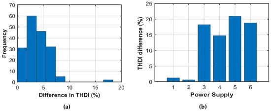 Percentage THDi variation for (a) LED lamps, (b) switch mode power supplies.