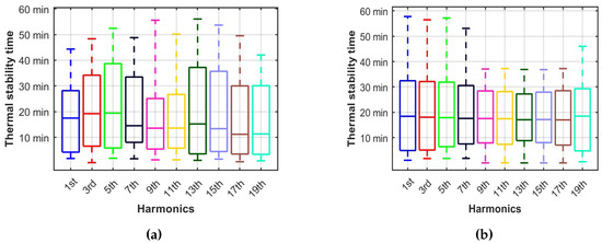 To determine the time required for thermal stability, we analyzed the value of 3 for the magnitude and phase variation of each LED lamp and SMPS. Figure 8a presents a box plot that shows the magnitude stability achieved by the different loads over time, while indicating a relationship between the mean, 5th, and 95th percentile values of stability time and harmonics. In this plot, the upper and lower whiskers are extended to the 99th and 1st percentile value of the stability time. It is evident from this figure that the majority of the load became thermally stable within 40 min. However, some loads took nearly 55 min to achieve thermal stability. The phase stability trends over time are shown in Figure 8b. While the overall stability of the phase angle variation for the 95th percentile of the load was improved in contrast to the magnitude, some loads still required up to 60 min to attain stable phase angles for certain harmonics when compared to the magnitude.
