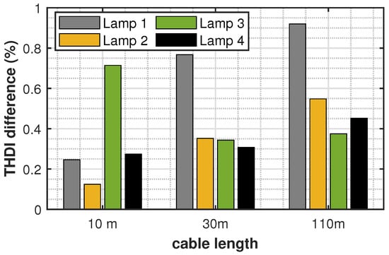 We performed several measurements of current harmonic emission from loads, while including various lengths of cables during the experiment. LED lamps were selected as loads because of their stable harmonic emission profile. These lamps were warmed up for at least 1 h to remove any variation in their current harmonic emission profile due to thermal stability. We used three cable lengths of 10, 30, and 110 m and measured the LED lamp’s harmonic emission profile with and without attaching cables between the lamps and measurement device. For this purpose, we used a three-core stranded 1.5 mm 3G cable, which is the most commonly used cable in building electrical installation. Figure 9 shows the THDi difference for the different loads with and without cables.