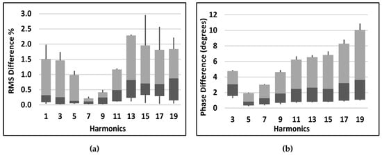 Boxplot showing harmonic difference in (a) percentage magnitude with cables, (b) absolute phase difference with cables.