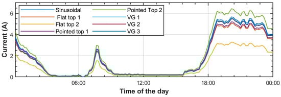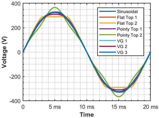 To account for the unpredictability of networks in harmonic estimations, we suggest taking into consideration multiple voltage waveforms while measuring the current harmonic emissions of loads. Various studies have also implemented this approach to analyze the effect of networks on the current harmonic emissions of various loads, including electric vehicles (EVs). In our measurement process for recording current harmonic emission profiles of individual loads for the SHEM model, we used different voltage waveforms, as shown in Figure 12. Along with standard distorted waveforms such as sinusoid, flat-top and pointed-top, we included actual voltage waveforms measured in the network at different times of the day, namely VG1, VG2, and VG3, recorded in the morning, evening, and non-peak hours. We generated these waveforms using our measurement setup and measured the current harmonic emission profile of the loads. This resulted in a portfolio of measurements that enabled us to include the impact of network uncertainties in our SHEM model.