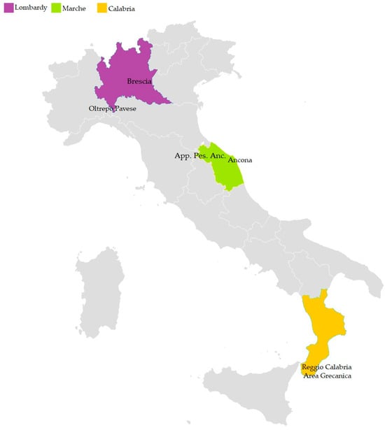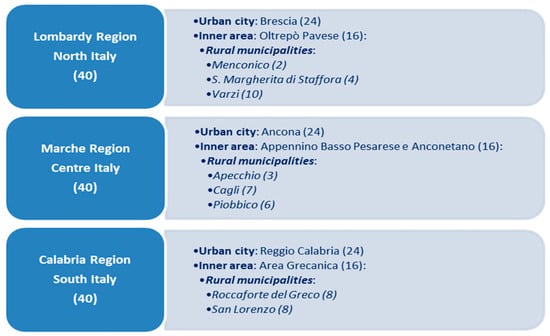 In each region, the survey was carried out in one medium-sized urban city (according to a population size of 100,000–200,000 residents, respectively, Brescia, Ancona, and Reggio Calabria) [1], and in one inner area, as defined by the National Strategy for Inner Areas [37], i.e., an area that is not easily accessible, with progressive depopulation and an ageing process, socioeconomic depression, and the low provision of services (respectively, Oltrepò Pavese, Appennino Basso Pesarese Anconetano, and Area Grecanica). In total, 72 urban and 48 rural interviews were conducted, the latter involving a total of eight rural municipalities.