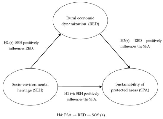 Theoretical model and research hypotheses; SEH, socio-environmental heritage; RED, rural economic dynamization; SPA, sustainability of protected areas.