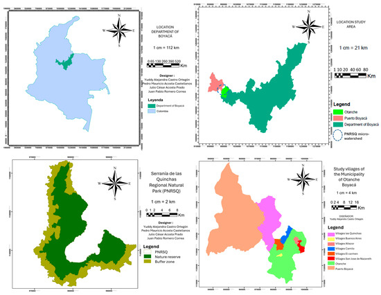The working unit for this research was established as the Regional Protected Areas of Colombia, specifically the Regional Natural Park Serranía de las Quinchas (PNRSQ), as the unit of analysis. The buffer zone of the PNRSQ in the municipality of Otanche, Boyacá, established the population of the families that are part of the productive units of the zone of influence in the buffer zone of the PNRSQ in the municipality of Otanche, Boyacá Department, Colombia. The sample started from a selection based on the non-probabilistic method by establishing a relational element, that is, the families that are part of the productive units of the villages “Buenos Aires, Las Quinchas, Camilo, El Carmen, Altazor and San José de Nazareth”, as these are the five buffer zones of the park in the municipality of Otanche, Boyacá, as shown in Figure 2, which also shows the location of the PNRSQ in the municipality of Otanche, Boyacá Department, Colombia.