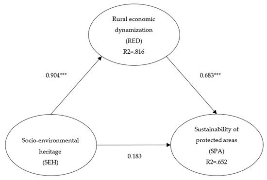 These aspects are supported by the statistical analysis carried out in PLS, where it was established that the direct influence on the SPA of the PNRSQ buffer zone and RED indicates a higher path coefficient than SEH. This result was statistically significant and allowed for establishing how an endogenous variable or dependent variable (SPA) receives the influence of another variable, in this case, the exogenous variable or independent variable (SEH). This demonstrated the direct influence exerted by the independent variable on the dependent variable and the influence on the SPA, thus testing the following established hypothesis: RED mediates the influence of SEH on the SPA of the PNRSQ buffer zone [63].