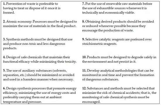 In line with the above, more and more research programs about Green Chemistry [17,25,34] are being undertaken due to its potential contribution to sustainable development. Currently, important initiatives are being carried out to establish, at national and international levels, the principles and practices of Green Chemistry.