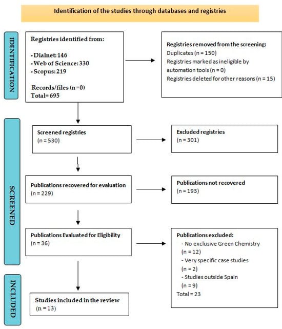 To carry out this review, only studies published in the last 6 years, i.e., from 2018 onwards, were included to ensure the timeliness and relevance of the information. The search was limited to articles written in English and Spanish with free access to the full text. The types of studies included are journal articles and review articles that address the teaching of Green Chemistry at any educational level, from primary education to higher education. Also chosen were articles that included research about practices, strategies, methods, or approaches used to teach the principles of Green Chemistry.