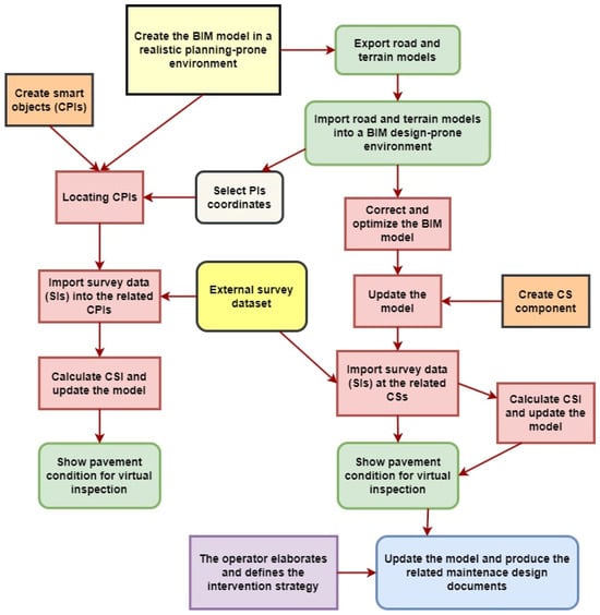 Infrastructure-related BIM solutions, uses, and case studies are continuously increasing [12,24]. Despite an initial gap with the building sector, increasing attention and relevant dedicated efforts have been pushing I-BIM to remarkable levels, especially for design and construction phases [14,25,26,27,28,29,30]. Considering in particular road maintenance and management phases, some methodological approaches, technical applications, and procedural frameworks have been slowly proposed, evidencing the clear benefits related to management improvement, asset condition knowledge exploitation, realistic modeling, user-friendly environment, and coding opportunities for introducing analytical tools derived from traditional PMSs [7,23,25,31]. After some initial methodological analyses and proofs of concept [7,31], specific applications were effectively proposed. For example, despite being developed in Revit®—not an infrastructure-oriented environment—a preliminary and simplified maintenance framework, based on Dynamo® algorithms, is proposed in [16]. Similarly, Cho et al. [32] defined an operative framework dedicated to spalling maintenance. Considering, instead, specific solutions for I-BIM environments, Bosurgi et al. [15] proposed an original pavement condition information modeling framework, paving the way for the exploitation of survey data and information related to maintenance management and planning. In this research, the authors specifically defined original smart objects, enriched with condition information derived from high-performance surveys, to handle pavement quality data on a realistic model of the road and of the environmental context. The original routines proposed by the authors allow the operators to automatically import road condition data in the related infrastructure components and to easily investigate the road conditions through different visualization and analysis tools, for more sound and robust decision making. Once specific and customized variables can be input and processed in the BIM environments, even sustainability-based or life cycle cost analysis (as in [33], even though in this case the analysis is performed on an entire corridor basis) can be implemented to support the decisional phases.
