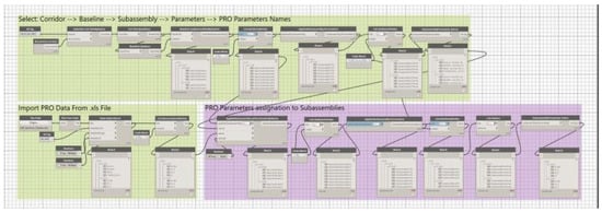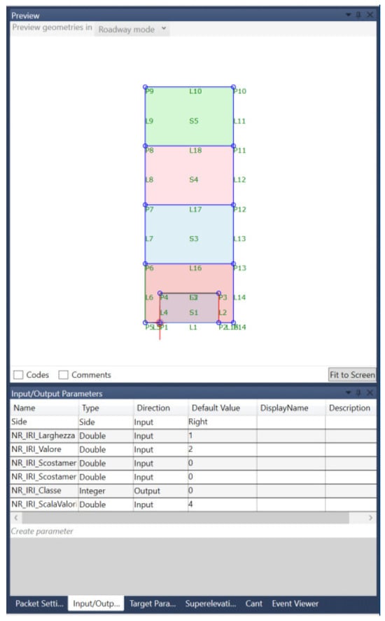 Then, the authors tested the possibility of showing pavement conditions in the cross-section views, ensuring an immediate visual link with the different segments of the infrastructure, for supporting the subsequent decisional stages. This procedure required specific customization of the elaboration framework; in particular, a customized virtual component of the cross-section was originally defined. As in Section 4.1, this element acts as an “information container”, for visualization purposes and is effectively linked to the same alignment of the corridor. This element is called in the following “condition subassembly” (CS), as it becomes part of the assembly defining the road corridor cross-section. The CS involves “not real” customized smart objects, used only for storing and representing the condition data derived from surveys (such as the CPIs in Section 4.1). Specific extended attributes, customized in compliance with the survey data features and the aim of the research, were defined for the CS. The CS object was designed and created in a dedicated environment by defining various display bars representing the quality classes for the various SIs. An example view of the CS definition approach is provided in Figure 8. CS was conceived as a combination of geometrical parametric objects (points, links, and shapes) that can be linked to the SI values through customized input and output parameters and original processing routines.