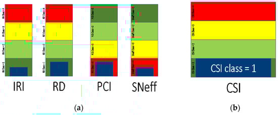 On this basis, specific CSs were conceived and defined for all the SIs listed in Section 3, i.e., SNeff, RD, IRI, and PCI. The reference values, for graphical benefits, were normalized to make the CSs mutually comparable. The various CSs, then, were assembled in the I-BIM environment as part of a novel virtual assembly (Figure 9a) which was connected to the road geometry, defining a virtual corridor representing the condition information variation along the road segments. Analogously, a similar procedure was also applied to a further CS referring to the CSI (Figure 9b).