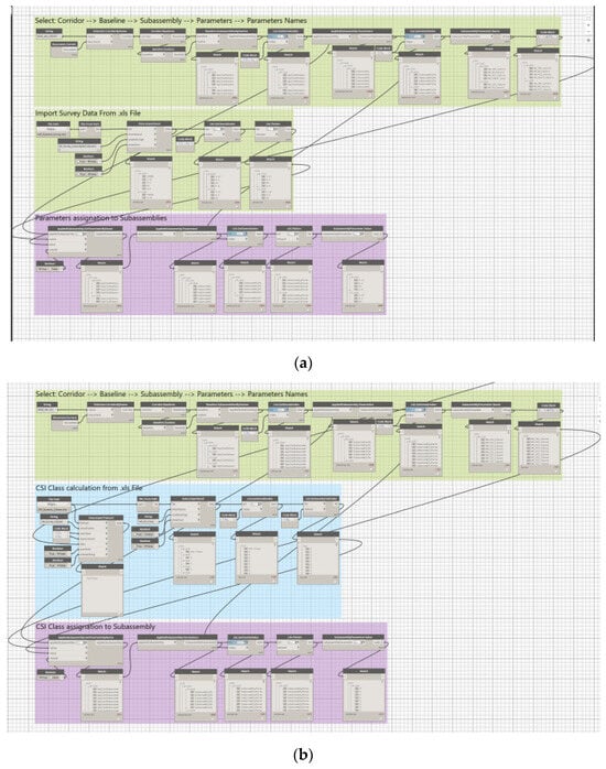 At this stage, in truth, the various CSs have empty extended attributes, since there is not a built-in function to link the survey results and the reference visualization components. Then, this task requires further specific customized solutions that can rely on specific routines developed in Dynamo®—a powerful tool conceived for parametric visual coding, aiming at automatizing some activities in the BIM environment—the feasibility and convenience of which was investigated in this research. In the proposed framework, this tool was used to define original routines to (1) read and import the single values of the SIs stored in external digital datasets, (2) assign each of these values to the specific CSs, according to their geographical information, (3) calculate the CSI values for each section referring to each segment as a function of the values of the reference SIs and characterize the related CSs. The overall original routines proposed for these tasks are schematically represented in Figure 10.