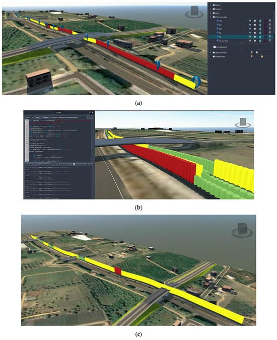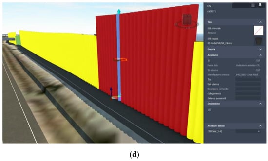 Once the model is updated, it can be directly analyzed in the realistic I-BIM environment, exploiting benefits of visualization and virtual inspection. Indeed, the CPIs act as continuous 3D bar diagrams along the selected infrastructure, ensuring an immediate understanding of pavement conditions at the various segments. This can be performed in terms of the single SI (Figure 12a), of the various SIs together (Figure 12b), or of the synthetic CSI value (Figure 12c). Further, in Figure 12d a focus on a single CPI is provided, with a view of the related extended attribute information in the object “property view”. All the screenshots provided in Figure 12 represent the visual result of the introduction of the original smart objects (CPIs) into the realistic I-BIM environment and of their information enrichment by means of the original routines defined by the authors. Only the road and the terrain models and the external contexts are created using built-in functionalities.