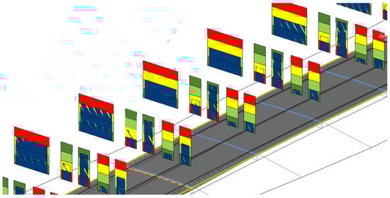 Considering the approach discussed in Section 4.1, once the various test stations were located in the global model and the various CPIs were introduced in the 3D model, the characterization routines were executed to load the different SI attributes extracted from the external database. Additionally, the CSI calculation routine is performed to evaluate this synthetic indicator and characterize the related “container”.