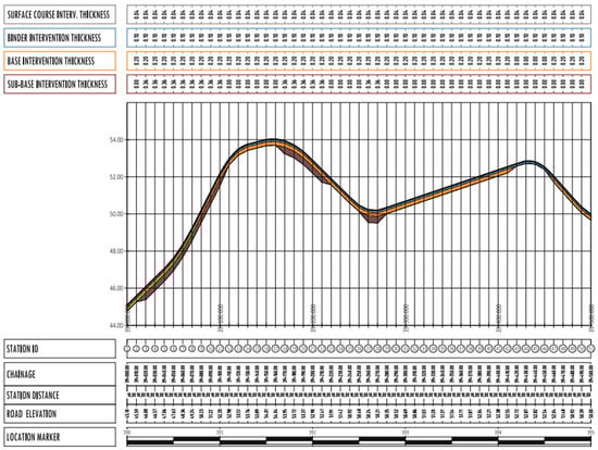 Once the model is updated, analogously, the pavement conditions can be evaluated and analyzed within this I-BIM environment. This framework is beneficial not only for visualization and virtual inspection of the infrastructure but also for defining intervention types and producing the necessary rehabilitation design documents within the same operational environment. In this scenario, the virtual corridor, composed of various CSs, can allow for the assessment of pavement conditions and quality—measured by SIs and CSI—along the road alignment (Figure 13). This serves as a foundation for the intervention evaluation, but further processing algorithms can be implemented as decision support tools. As detailed in Section 4.2, different simplified intervention types were included in a reference catalogue and selected for each segment based on the critical conditions of SIs and CSI: the worse the indicator values, the more extensive the demolition and reconstruction intervention. This approach can be used to generate the necessary technical documents for maintenance and rehabilitation interventions, such as section views (showing also ex ante conditions and rehabilitation depth—Figure 14) or profile views (indicating rehabilitation depth for various pavement segments—Figure 15). The presented representations (to be complemented by quantity take-offs and other analytical reports and computations) are preliminary examples of the methodological approach. As these representations evolve and are enriched with state-of-the-art techniques, they can be used to precisely define the intervention activities.