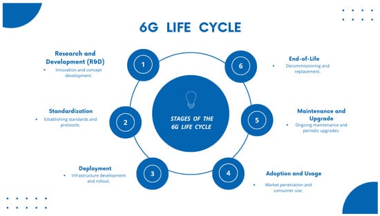 The 6G lifecycle encompasses several key phases: research and development, standardization, deployment, adoption and usage, maintenance and upgrades, and end of life as shown in