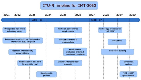 Over the past 30 years, the International Telecommunication Union’s radio communication division (ITU-R) has successfully coordinated global efforts in developing broadband IMT systems, progressing through IMT-2000 (3G), IMT-Advanced (4G), and IMT-2020 (5G). They are now working toward IMT-2030 (6G). In June 2022, the ITU-R set a timeline for 6G development in three stages: Stage 1 (vision definition) to be completed by June 2023, Stage 2 (requirements and evaluation methodology) by 2026, and Stage 3 (specifications) by 2030. The three-stage timeline and the tasks for each stage are summarized in