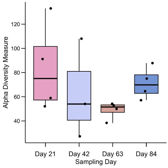 We observed significant differences in the mesofauna populations (Chao) between the different sampling time points (Kruskal–Wallis chi-squared = 11.517, p = 0.009236) (Figure 1). However, there were no significant differences in all other alpha diversity metrics among the composting treatments and durations.