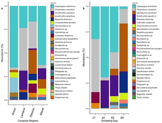 Top 30 mesofauna species facilitating degradation of the green nitrogenous feedstock. (a) mesofauna species diversity by compost type and (b) composting day.