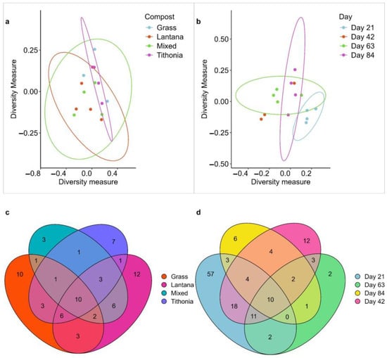 Principal Coordinate Analysis (PCoA) of eukaryotic community ellipse clustering indicating their distribution based on compost treatment (a) and composting day (b). Venn diagrams show the distribution of unique and shared ASVs within the various compost treatments (c) and composting days (d).