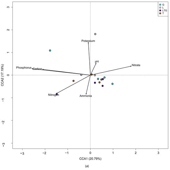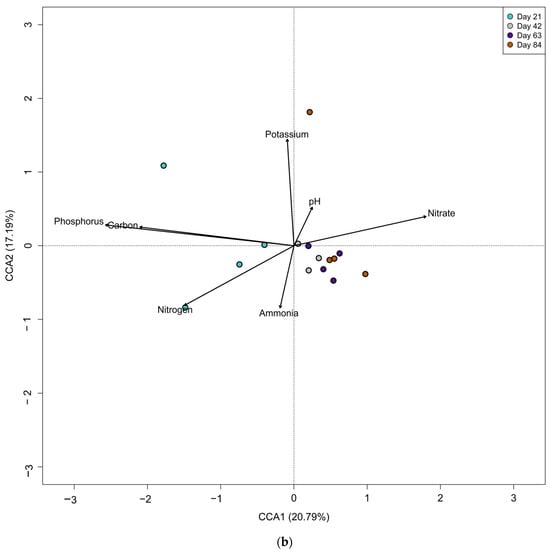 The ordination biplots showed the compost abiotic characteristics that significantly influenced the mesofauna assemblages (p = 0.001). Temperature and organic carbon content produced the highest rate of change in the mesofauna communities. These physical–chemical elements and pH and total nitrogen, nitrate, and phosphorous contents significantly influenced the mesofauna community structure (Figure 4a). No groupings were observed based on composting materials, while the composting duration plot showed that ammonia, phosphorous, and total nitrogen contents were major community structure shapers after 21 days of composting. On the other hand, pH and nitrate content had a higher influence on the composition and abundance on the 42nd day of composting (Figure 4b).