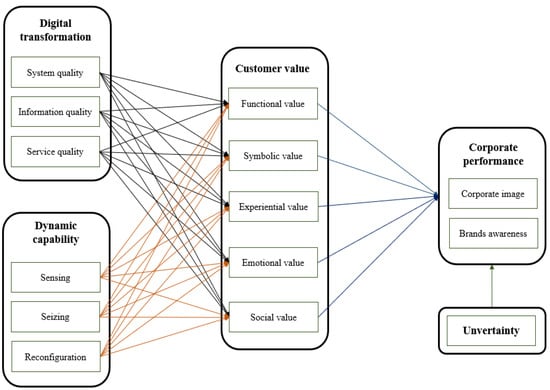 Hwang, Lee, and Kim [25] analyzed the quality of the digitalization of library services and organized digital quality into three independent variables—system quality, information quality, and service quality. In doing so, they found that system quality consists of accessibility, security, and ease of use; information quality comprises sufficiency, variety, up-to-dateness, accuracy, and usefulness; and service quality involves customer support, customization, and reliability. This research used these studies to investigate the association between digital transformation and dynamic capability on companies’ service quality, changes in customer value due to this service quality, and corporate performance, as perceived by customers.