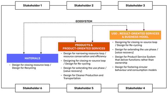 The literature has acknowledged design’s role as a catalyst in fostering the transition from the linear process to one that is more regenerative and circular. One of the most cited works in this research field was the study by Bocken and colleagues [42]. They identified a framework of strategies for product design and business models aimed at moving from a linear to a circular economy. Building on Stahel’s theory [43], they suggest eight product-design strategies to narrow, slow, and close the resource loop. These design strategies are highly linked to the physical product design and engineering process, for which design deals with the problem of goods, structure, components, and materials used, such as design for attachment and trust, design for maintenance and repair, or design for dis- and reassembly. The framework addresses the need for companies to implement design and business model strategies in conjunction.