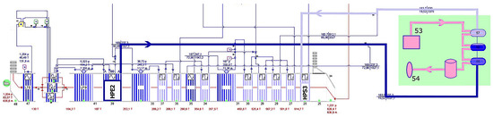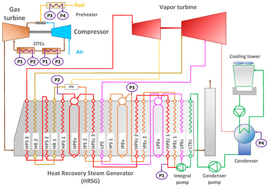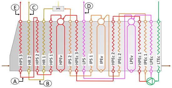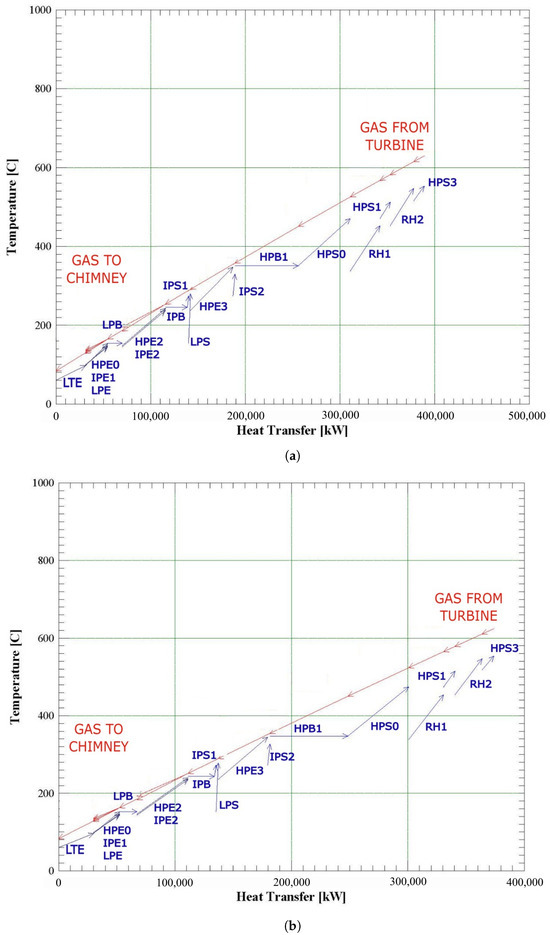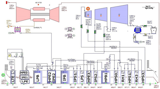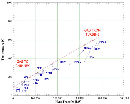Figure 5 shows the temperature–heat transfer diagram of the HRSG. Red arrows represent the gas turbine exhaust flow and blue arrows represent the steam flow, where the different economizer, evaporator, and superheater exchangers are appreciable.