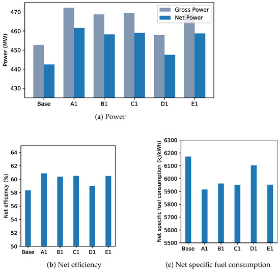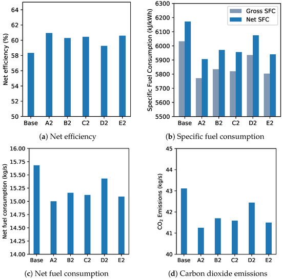 For the comparison of the studied alternatives, a representative set of parameters defining the performance of combined cycles were used: gross and net efficiency, gross and net specific fuel consumption, thermal power absorbed, fuel mass flowrate, and emissions.