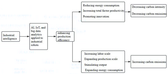 While industrial intelligence improves production efficiency, it can also lead to an expansion in the labor and production scale, resulting in higher energy consumption and carbon emissions. Studies indicate that enterprises with industrial robots tend to have larger workforces and are more likely to expand employment compared to those without robots. This expansion is due to mechanisms where industrial robots enhance production efficiency, expand production scale, and create demand for related technical positions [37]. The use of robots boosts productivity and energy efficiency, which stimulates increased production and consumption. Industrial robots can increase labor demand in enterprises by expanding the production scale [10,26,27,38]. According to the theory of heterogeneous enterprises, the use of robots can enhance the competitiveness of enterprise products, drive up product demand and output scale, and thus increase the labor demand in production. Enterprises introduce industrial robots to improve production efficiency, thereby increasing the scale of employment [39]. Overall, industrial intelligence can lead to an expansion of production and labor scales, which may stimulate an increase in output accompanied by a greater energy consumption, potentially leading to higher carbon emissions, as shown in Figure 1.