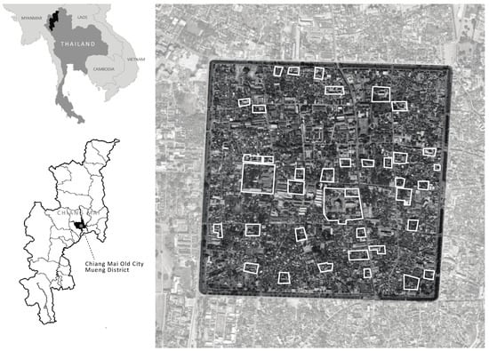 The study focuses on the Chiang Mai Old City area at the center of Chiang Mai Province. This area has a square shape covering 1.6 square kilometers and is surrounded by a historic city moat (18.790° N, 98.987° E). Chiang Mai served as the capital of the Lanna Kingdom from 1296 to 1768, a tributary state of Siam from 1774 to 1899, and has been a second-level subdivision of Thailand since 1933. Located 700 km north of Bangkok, Chiang Mai sits 310 m above sea level. The region has an annual rainfall of approximately 1200 mm and an average temperature of 27–28 °C. The climate is characterized by a wet season (April to November) and a dry season (December to March), with most rainfall occurring between May and October. This investigation was conducted at 38 Lanna temples situated within the Old City area (see Figure 1).