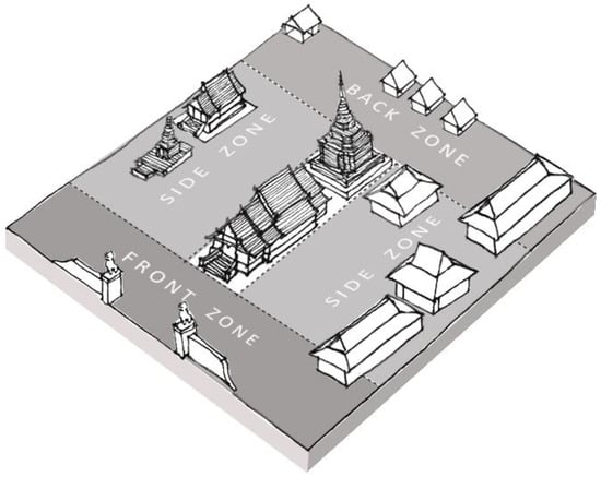 This study employs a multi-criteria approach, integrating concepts from landscape studies and urban forestry, based on tangible and intangible elements as per the Historic Urban Landscape (HUL) framework. Temple layouts were zoned by key buildings such as the main pavilion and the pagoda, which serve as the center points for discussing plant materials in each area. The projection lines were then set to the temple’s land boundary (see Figure 2). Temple zones were categorized into the front, side, and back zones.