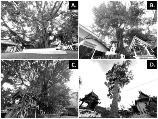 Heritage tree of Chiang Mai Old City in temple area. (A) Bhodi tree (Ficus religiosa) in Wat Phra Chao Mengrai temple. (Location: 18°47′05.23″ N, 98°59′02.54″ E). (B) Bhodi tree (Ficus religiosa) in Wat Umong Maha Thera Chan temple. (Location: 18°47′22.71″ N, 98°59′22.38″ E). (C) Bhodi tree (Ficus religiosa) in Wat Chiang Man temple. (Location: 18°47′35.94″ N, 98°59′19.95″ E). (D) Yang tree (Dipterocarpus alatus) in Wat Chedi Luang temple. (Location: 18°47′12.00″ N, 98°59′16.68″ E).