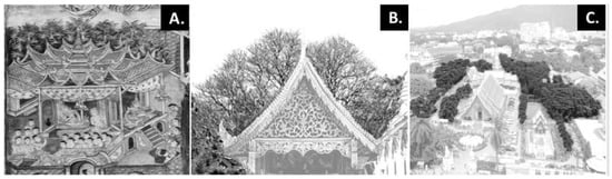 Relationship between the plants depicted in a mural painting and the Lanna temple landscape and city skyline in Chiang Mai Old City. (A) Mural painting in the grand pavilion of Wat Phra Singha temple (Location: 18°47′18.14″ N, 98°58′52.37″ E). (B) Pavilion in Wat Chiang Man Temple (Location: 18°47′37.17″ N, 98°59′22.38″ E). (C) Perspective view of Wat Phra Singha and the urban skyline (Location: 18°47′18.69″ N, 98°58′55.01″ E).