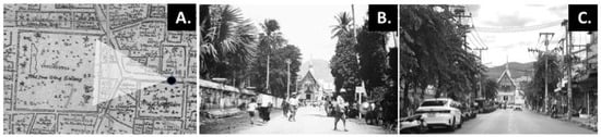 The scenery of the area in front of the temple grounds of Wat Phra Singh in Chiang Mai Old City, including a tree as a component of the scenery. (Location: 18°47′18.42″ N, 98°59′00.70″ E) (A) Tree illustration on a map of Chiang Mai Old City by McCarthy in 1893. The black point indicates the location of (B,C). (B) The scenery of the area in front of the temple grounds of Wat Phra Singh in the early 1900s. (C) The scenery of the area in front of the temple grounds of Wat Phra Singh in 2023. (Source of map and photograph (B): National Archives of Thailand).