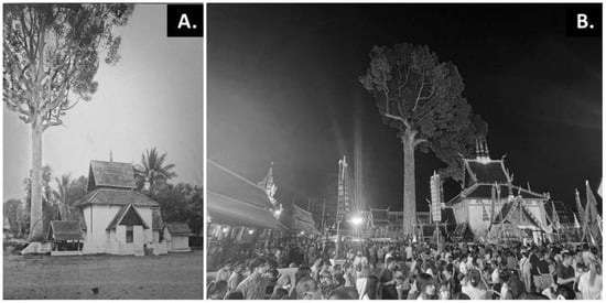 Sacred Yang Tree (Dipterocarpus alatus): The Iconic Tree of Chiang Mai Old City at Wat Chedi Luang Temple (Location: 18°47′11.92″ N, 98°59′16.43″ E). (A) Photograph of the sacred Yang tree in the early 1900s. (B) Sacred Yang tree during the city blessing ceremony in 2023.